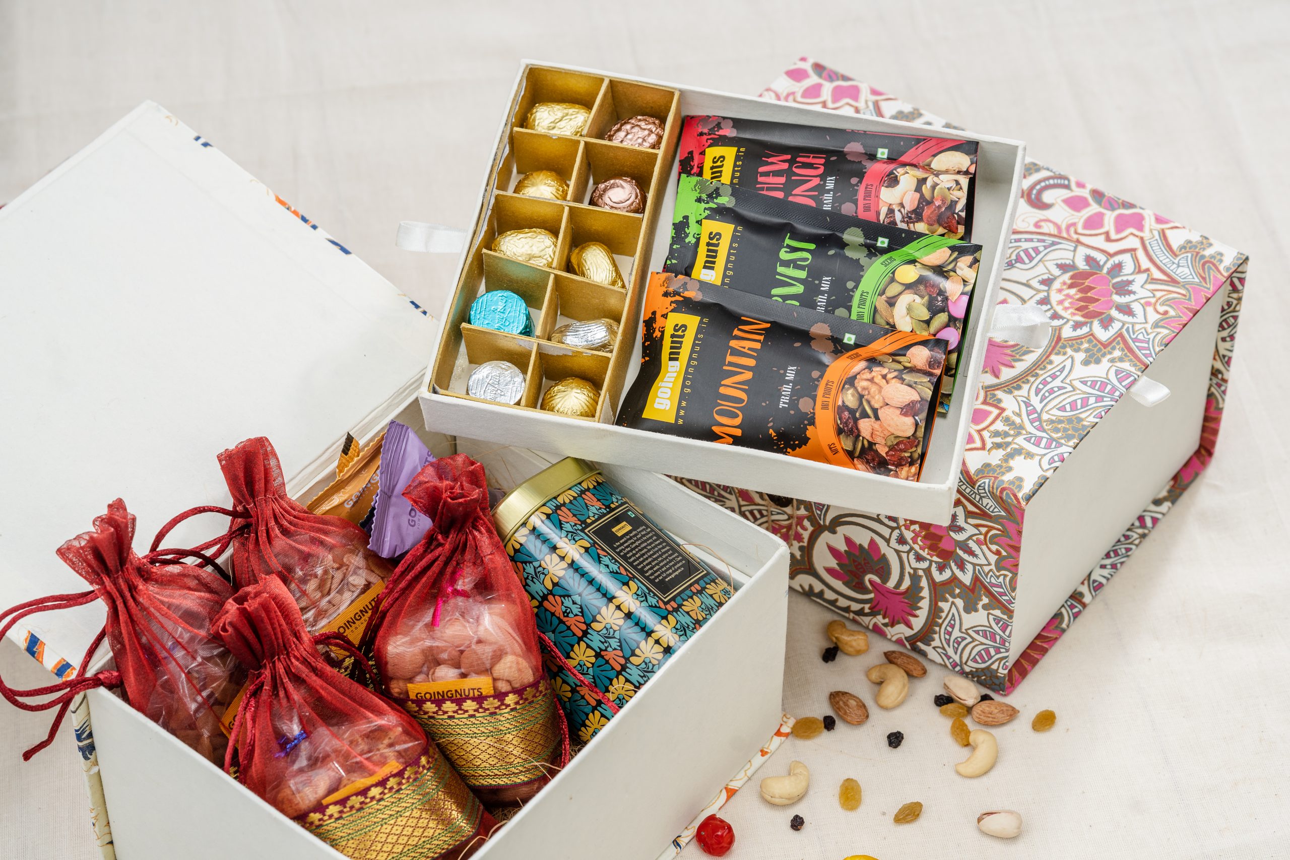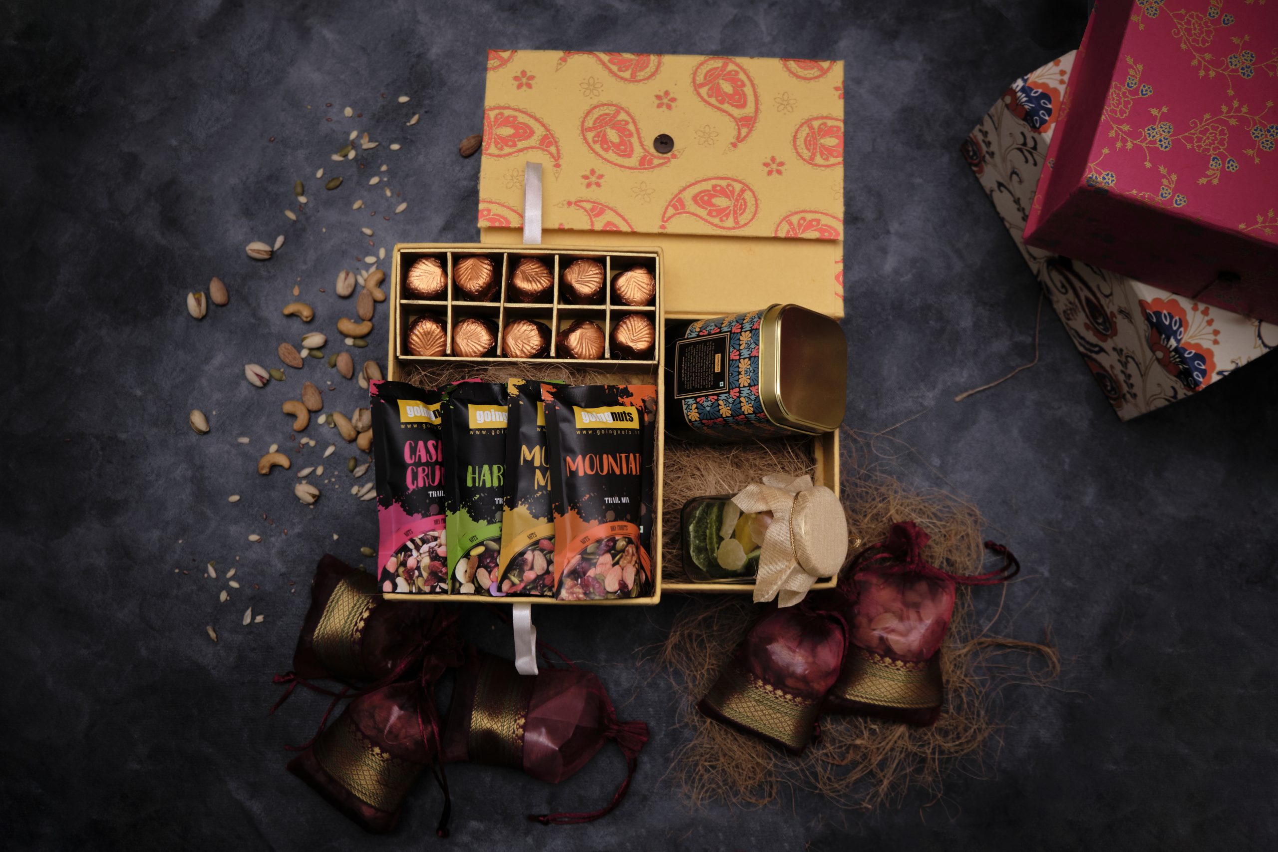 The Double Decker Hamper is made with reusable ethnic gift box made with 100% recycled handmade paper.