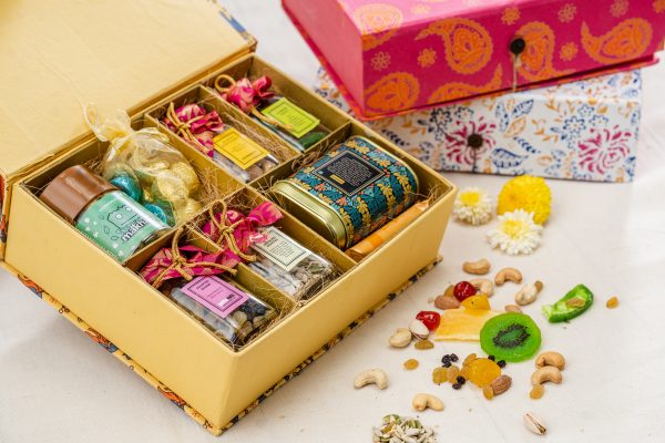 Assorted Roasted Nuts, Assorted Raisins, Assorted Dehydrated fruits, Seeds mix (slightly roasted), Assorted Chocolates, Flavoured makana, Energy bar (1 nos.), Harvest trail mix, Moringa Fruit & Nut Cookies