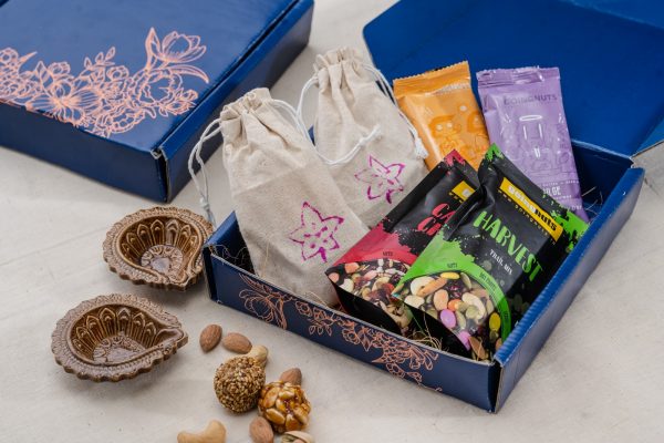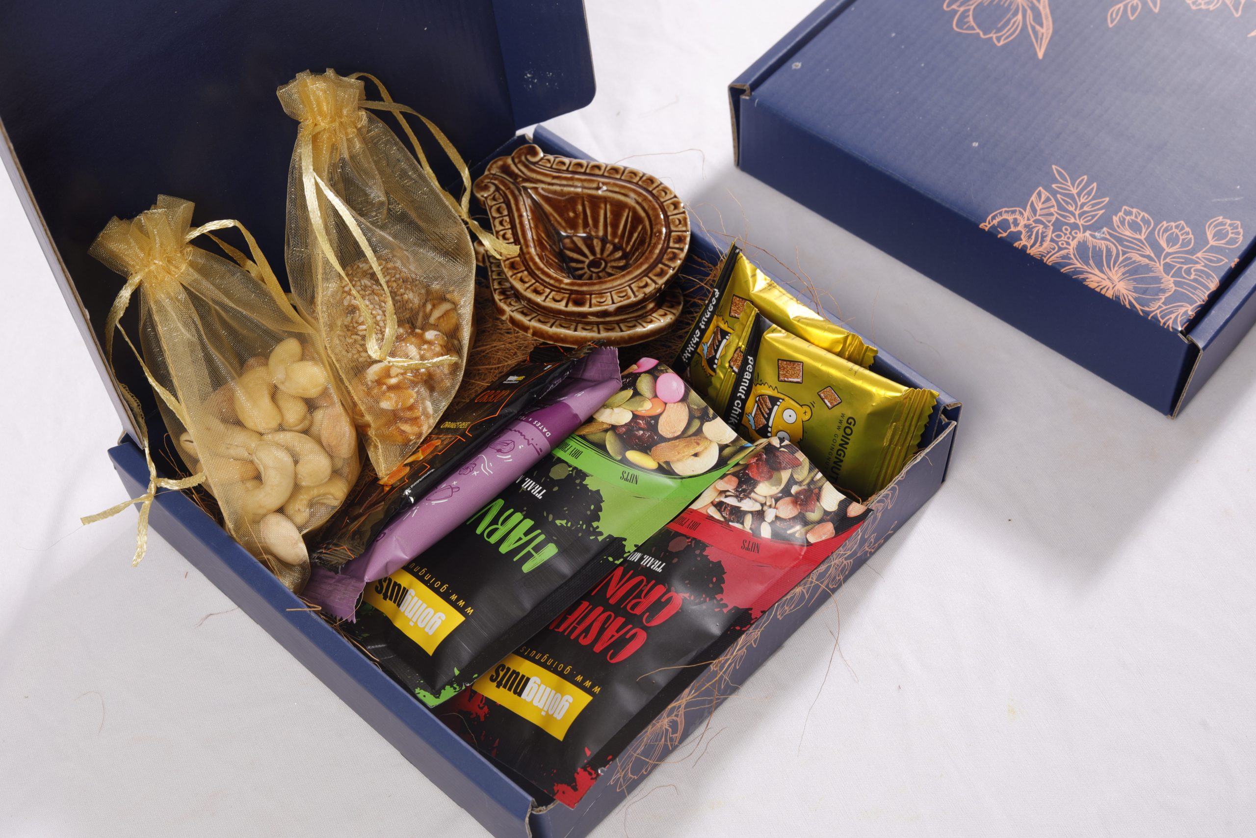 Assorted roasted nuts, Nutri balls, Energy bars (2 nos.), Cashew crunch Trail mix, Harvest Trail Mix, Ceramic dia (2 nos.)