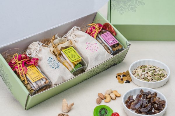 Contains – Assorted Roasted Nuts, Assorted dehydrated fruits, Assorted Raisins, Seeds Mix (Slightly Roasted) & Dry Gooseberry (Honey)