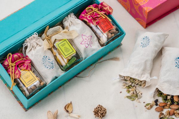 The Upthread Hamper is a reusable ethnic gift boxes made with 100% recycled handmade paper and glass bottles.